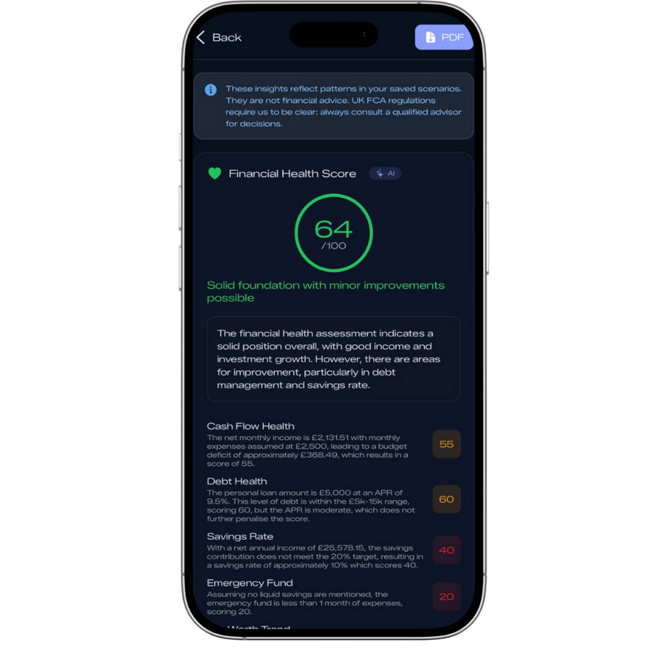 AI Insights + Financial Health Score (based on your saved scenarios)